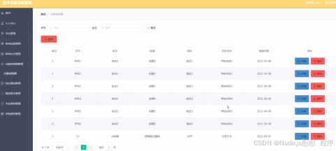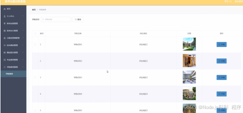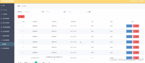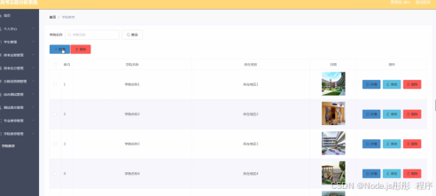 管理员点击学院推荐管理。在学院推荐页面输入学院名称进行查询、新增或删除学院推荐列表,并根据需要对学院推荐详情信息进行详情、修改或删除操作;如图5-10所示: