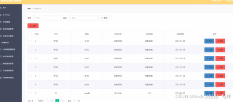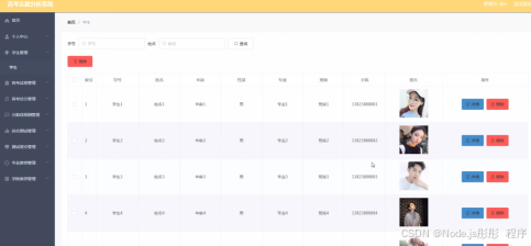 管理员点击学生管理。在学生页面输入学号和姓名进行查询或删除学生列表,并根据需要对学生详情信息进行详情或删除操作;如图5-3所示: