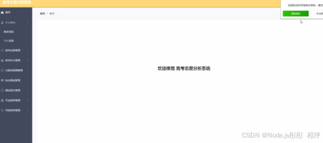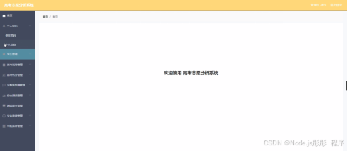 管理员进入主页面,主要功能包括对首页、个人中心、学生管理、高考试卷管理、高考估分管理、分数线预测管理、综合测试管理、测试提交管理、专业推荐管理、学院推荐管理等进行操作。管理员主页面如图5-2所示: