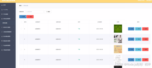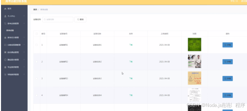 管理员点击高考试卷管理。在高考试卷页面输入试卷名称进行查询、新增或删除高考试卷列表,并根据需要对高考试卷详情信息进行详情、修改或删除操作;如图5-4所示: