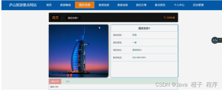 酒店信息,在酒店信息页面可以查看酒店名称、酒店类别、酒店星级、酒店地址、酒店图片、 联系电话、酒店介绍等详细内容,根据需要进行评论或收藏等操作,如图5-4所示。