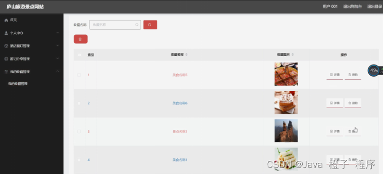 我的收藏管理,在我的收藏管理页面可以对索引、收藏名称、收藏图片等内容进行详情或删除等操作,如图5-21所示。