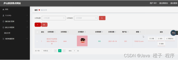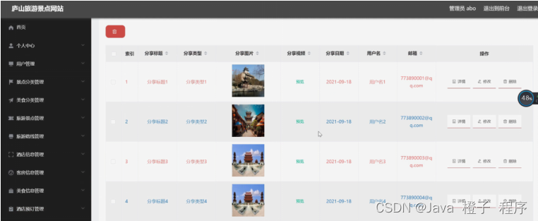游记分享管理,在游记分享管理页面可以对索引、分享标题、分享类型、分享图片、分享视频、分享日期、用户名、邮箱等内容进行详情、修改或删除等操作,如图5-17所示。