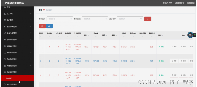 酒店预订管理,在酒店预订管理页面可以对索引、客房名称、客房类型、客房图片、客房状态、酒店名称、酒店地址、联系电话、客房价格、入住天数、总价格、入住人数、下单时间、入住时间、备注、用户名、姓名、手机、身份证、是否支付、审核回复、审核状态、审核等内容进行详情、修改或删除等操作,如图5-16所示。