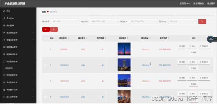 酒店信息管理,在酒店信息管理页面可以对索引、酒店名称、酒店类别、酒店星级、酒店图片、酒店地址、联系电话等内容进行详情、修改、查看评论或删除等操作,如图5-13所示。