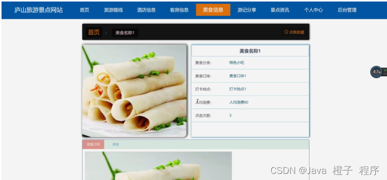 美食信息,在美食信息页面可以查看美食名称、美食分类、美食图片、美食口味、打卡地点、人均消费、点击次数、美食介绍等详细内容,根据需要进行评论或收藏等操作,如图5-6所示。