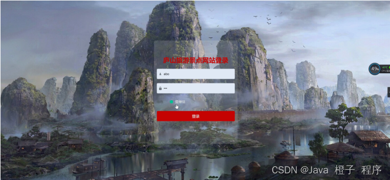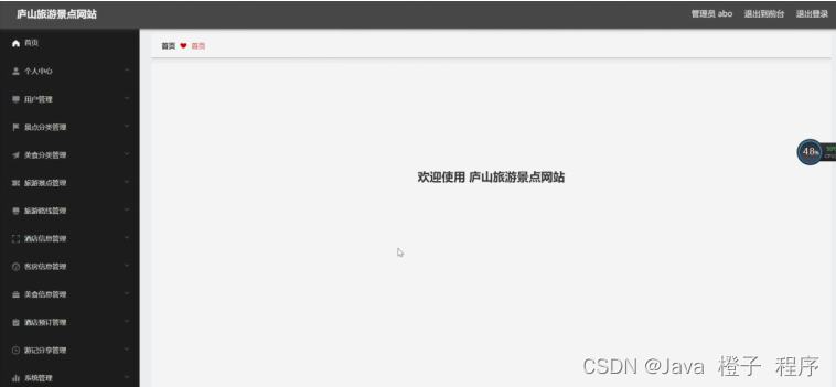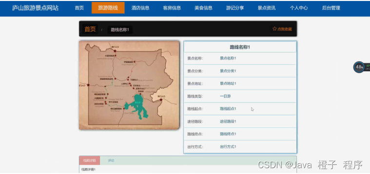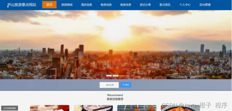 庐山旅游景点网站,在系统首页可以查看首页、旅游路线、酒店信息、客房信息、美食信息、游记分享、景点资讯、个人中心、后台管理等内容,如图5-1所示。