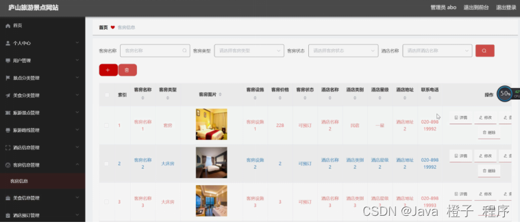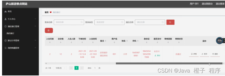 酒店预订管理,在酒店预订管理页面可以对索引、客房名称、客房类型、客房图片、客房状态、酒店名称、酒店地址、联系电话、客房价格、入住天数、总价格、入住人数、下单时间、入住时间、备注、用户名、姓名、手机、身份证、是否支付、审核回复、审核状态等内容进行详情、修改或删除等操作,如图5-19所示。