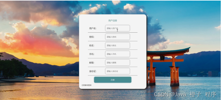 用户注册,在用户注册页面通过填写用户名、密码、姓名、手机、邮箱、身份证等信息完成用户注册,如图5-2所示。