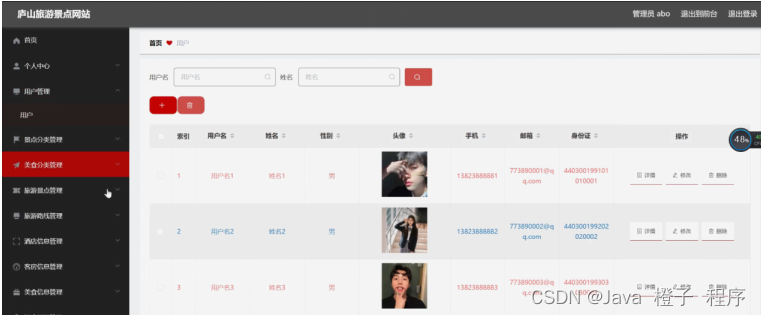 用户管理,在用户管理页面可以对索引、用户名、姓名、性别、头像、手机、邮箱、身份证等内容进行详情、修改或删除等操作,如图5-10所示。