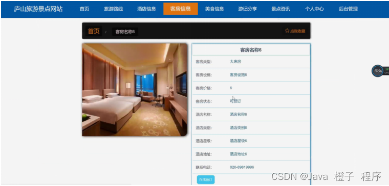 客房信息,在客房信息页面可以查看客房名称、客房类型、客房设施、客房价格、客房图片、客房状态、酒店名称、酒店类别、酒店星级、酒店地址、联系电话、客房介绍等详细内容,根据需要进行在线预订、评论或收藏等操作,如图5-5所示。