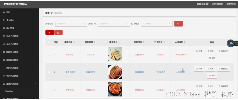 美食信息管理,在美食信息管理页面可以对索引、美食名称、美食分类、美食图片、美食口味、打卡地点、人均消费等内容进行详情、修改、查看评论或删除等操作,如图5-15所示。