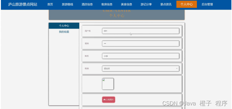 个人中心,在个人中心页面通过填写用户名、密码、姓名、性别、上传图片、手机、邮箱、身份证等详细内容进行信息更新操作,还可以根据需要对我的收藏进行详细操作,如图5-7所示。