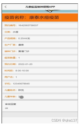 疫苗预约,在疫苗预约页面可以查看预约编号、疫苗名称、疫苗图片、分类、产品规格、生产厂家、接种门诊、疫苗数量、预约日期、时间段、用户名、手机、儿童姓名、儿童年龄等详细内容,如图5-7所示。