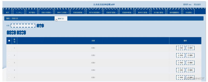 疫苗分类管理,在疫苗分类管理页面可以查看索引、分类等信息,并可根据需要对列表进行修改或删除等操作,如图5-12所示。