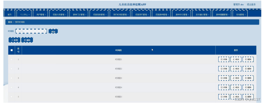 预约时间段管理,在预约时间段管理页面可以查看索引、时间段等信息,并可根据需要对列表进行详情,修改或删除等操作,如图5-14所示。