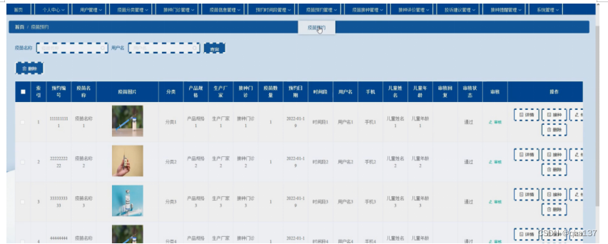 疫苗预约管理,在疫苗预约管理页面可以查看索引、预约编号、疫苗名称、疫苗图片、分类、产品规格、生产厂家、接种门诊、疫苗数量、预约日期、时间段、用户名、手机、儿童姓名、儿童年龄、审核回复、审核状态等信息,并可根据需要对列表进行详情,接种,修改或删除等操作,如图5-15所示。