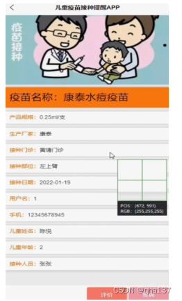 疫苗接种,在疫苗接种页面可以查看疫苗名称、疫苗图片、产品规格、生产厂家、接种门诊、接种部位、接种日期、用户名、手机、儿童姓名、儿童年龄、接种人员详细内容,根据需要进行评价、投诉操作,如图5-8所示。