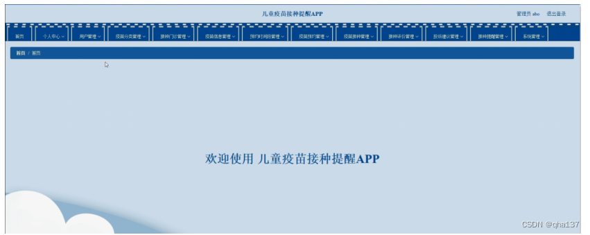 管理员登录进入儿童疫苗接种提醒app可以查看首页、个人中心、用户管理、疫苗分类管理、接种门诊管理、疫苗信息管理、预约时间段管理、疫苗预约管理、疫苗接种管理、接种评价管理、投诉建议管理、接种提醒管理、系统管理等内容进行详细操作,如图5-10所示。