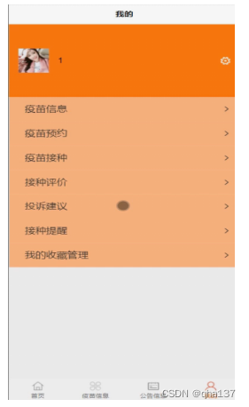 我的,在我的页面可以对疫苗信息、疫苗预约、疫苗接种、接种评价、投诉建议、接种提醒、我的收藏管理等功能进行详细操作,如图5-6所示。
