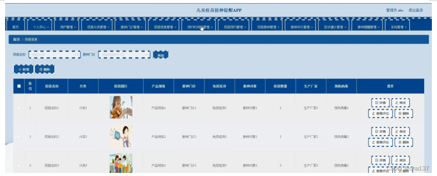 疫苗信息管理,在疫苗信息管理页面可以查看索引、疫苗名称、分类、疫苗图片、产品规格、接种门诊、免疫程序、接种对象、疫苗数量、生产厂家、预防病毒等信息,并可根据需要对列表进行详情,查看评论,修改或删除等操作,如图5-13所示。