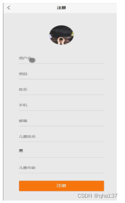 用户注册,在用户注册页面通过填写用户名、密码、姓名、手机、邮箱、儿童姓名、性别、儿童年龄等信息完成用户注册操作,如图5-2所示。