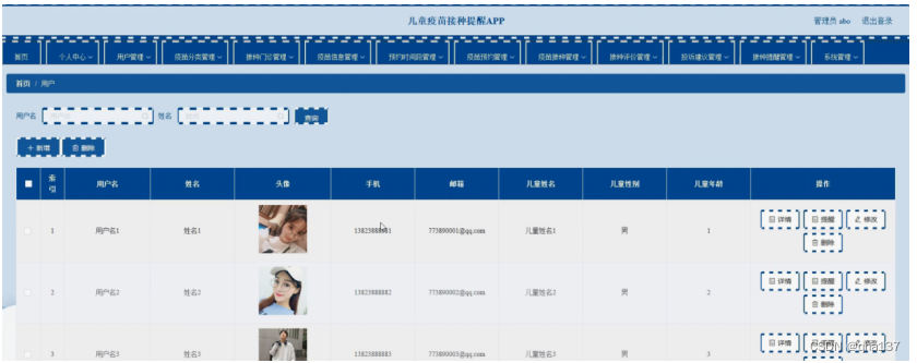 用户管理,在用户管理页面可以查看索引、用户名、姓名、头像、手机、邮箱、儿童姓名、儿童性别、儿童年龄等信息,并可根据需要对列表进行详情,修改或删除等操作,如图5-11所示。