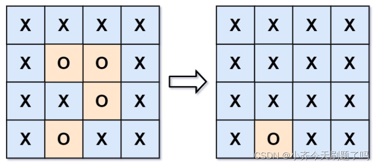 解释:被围绕的区间不会存在于边界上,换句话说,任何边界上的 'O' 都不会被填充为 'X'。 任何不在边界上,或不与边界上的 'O' 相连的 'O' 最终都会被填充为 'X'。如果两个元素在水平或垂直方向相邻,则称它们是“相连”的。