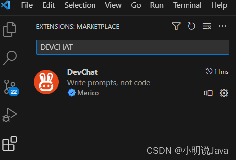 从 VSCode Marketplace 安装,或者VSCode里点左侧插件,搜索“devchat”安装。