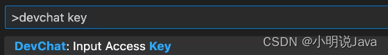 在弹出的命令面板中输入“devchat key”,点击如下命令,在弹出的输入框中粘贴进 DevChat access key(access key在注册邮件中获取)