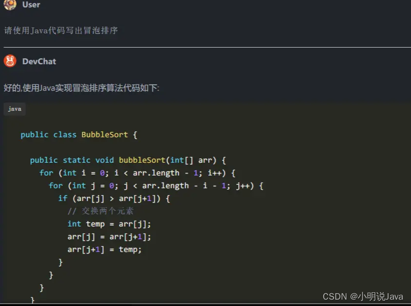 响应速度也是很快的,所以,使用Devchat AI,程序员们可以告别那些繁琐、重复的脏活累活,比如一些CURD等繁琐的时,将更多的时间和精力投入到创新和增值工作上。