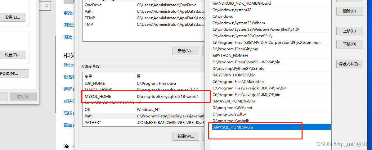 1.配置环境变量(建议配置MYSQL_HOME变量这样可能不会报错,可能安装了服务,却无法启动,会出现1067的错误,这个很坑)