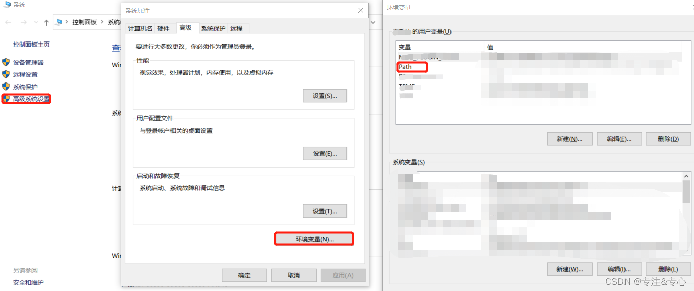 右击“我的电脑”,属性,如下图进行操作,找到“Path”变量,在其后面添加路径: