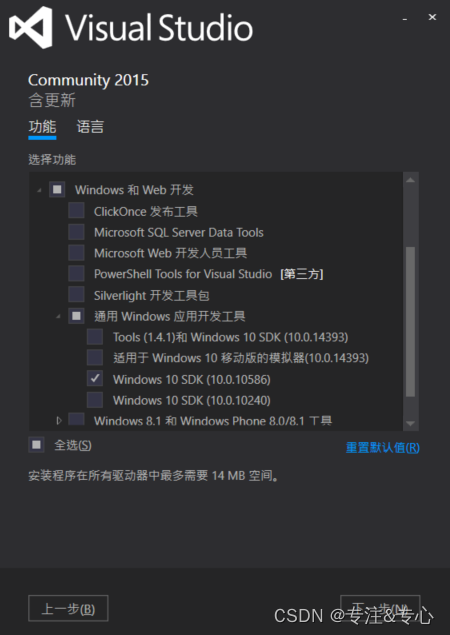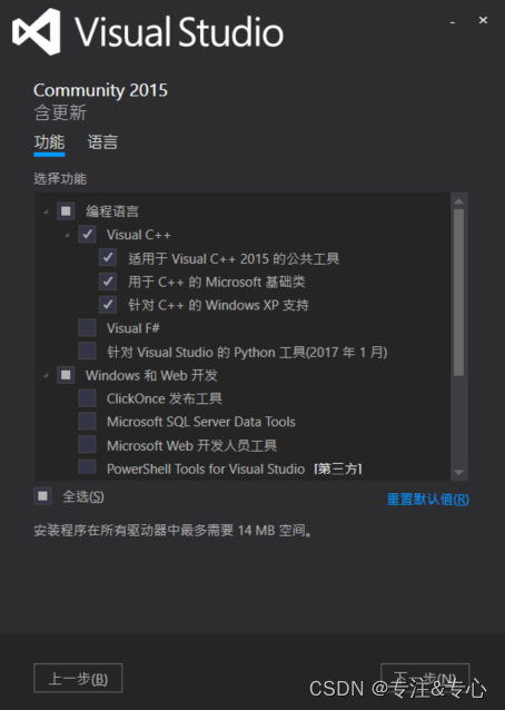 进入VS2015下载界面后,会看到很多选项,这时强迫症就有点犯了,就想要知道这些都有什么不