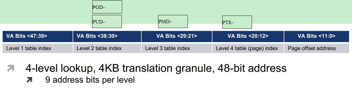ARMv8架构可以支持48位虚拟地址,并配置成4级页表(4K页),或者3级页表(64K页)。而本Linux系统只使用39位虚拟地址(512G内核,512G用户),配置成3级页表(4K页)或者2级页表(64K页)