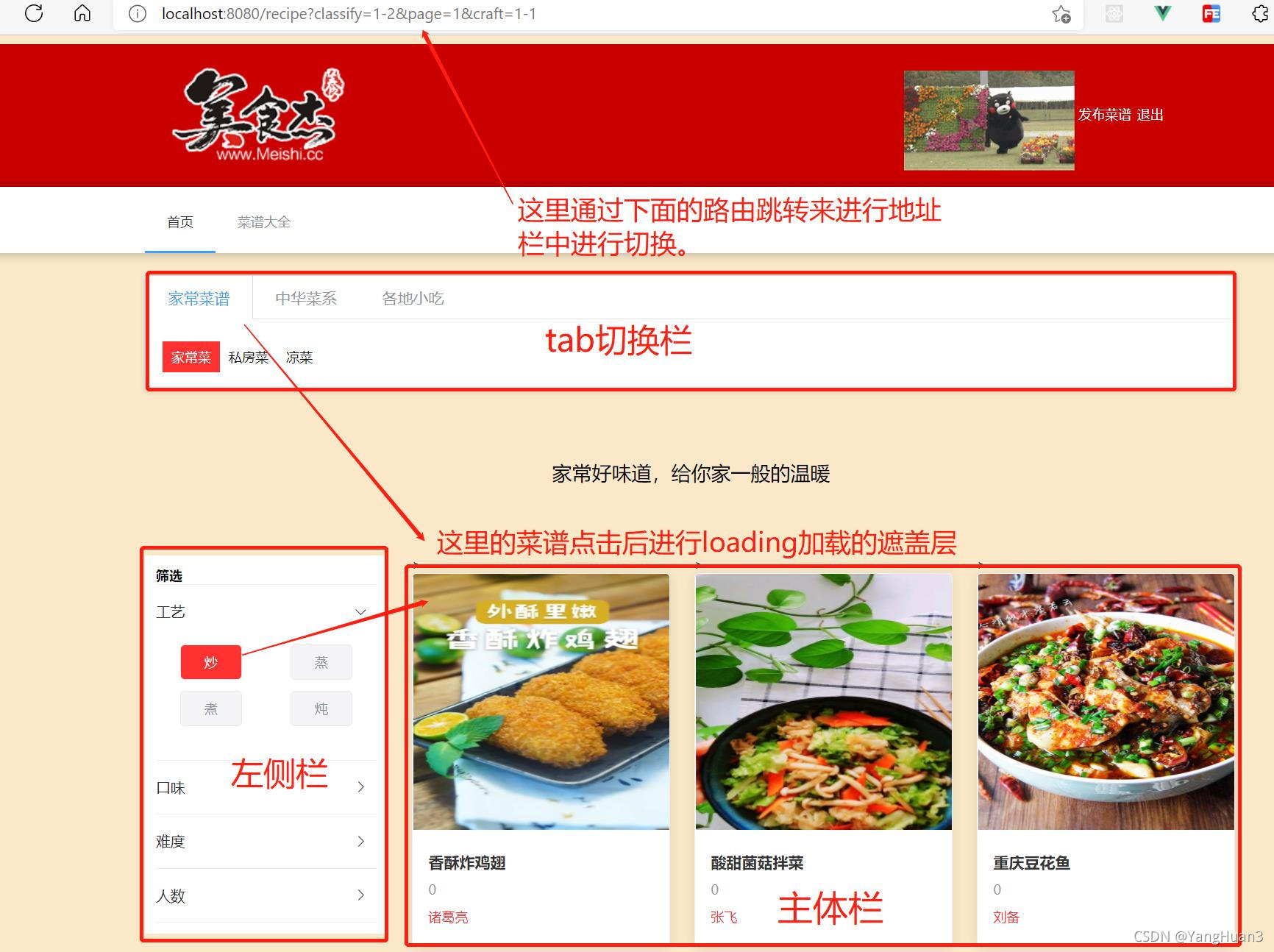 美食杰,菜谱大全,loading事件和对应内容显示实现效果(四) 这篇文章是根据上篇文章:美食杰,菜谱大全组件中,零碎的组件实现效果(三)_qianluo111的博客-CSDN博客续写的效果,这个效果是展示右侧的内容通过最上面的tab切换和左边的侧边栏来实现的。右侧的主体的loading加载和显示内容主体。下面开始讲解一下我们要实现效果的过程啦!第一步:先实现我们右侧的主体栏的数据。我们首先要将后端数据获取到,这个就是import{getMenus}from'@/service/api';第二步:调用获取到的数据data将其...