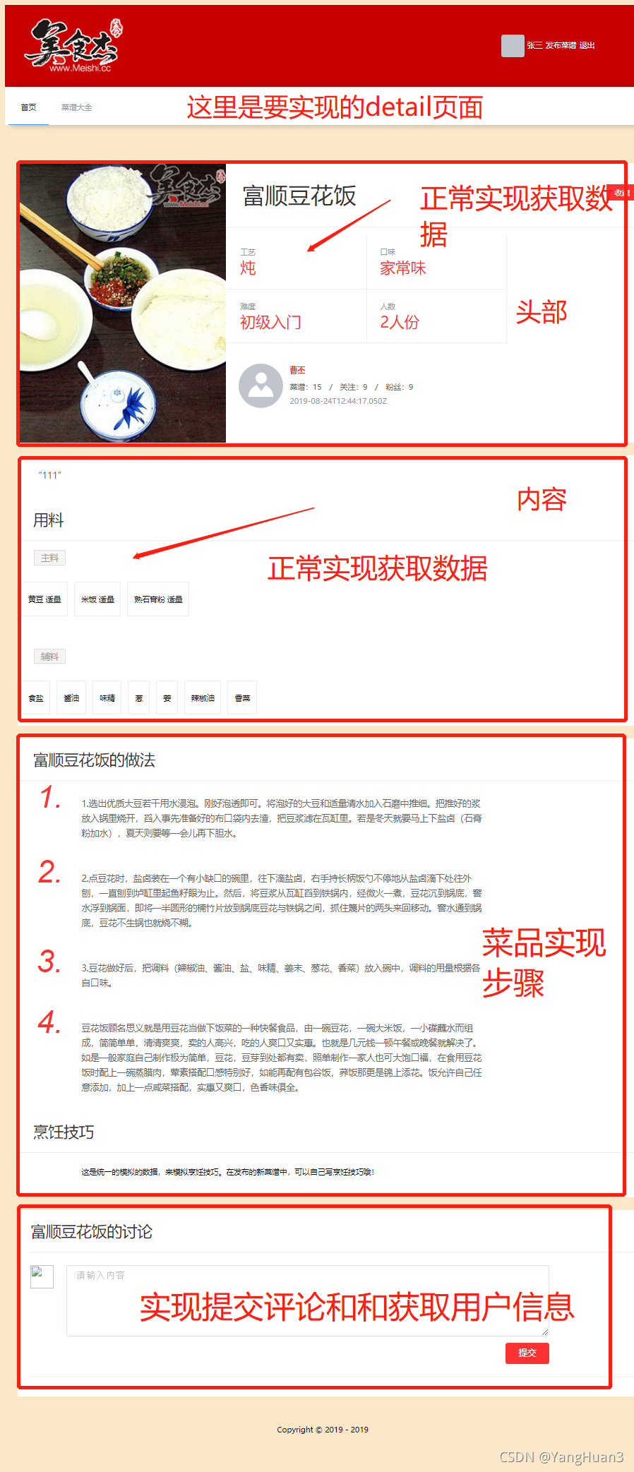 美食杰,菜品详情,头部,内容,评论个部分实现其效果(五) 最近一直在写美食杰这个项目,但是这个项目已经到了尾声啦!今天要说的是我们最后一部分组件的实现,这个部分要用到的就是传数据获取数据跟之前讲的(1条消息) 美食杰-space个人空间站!创建实现,关注,作品,粉丝,收藏!(二)_qianluo111的博客-CSDN博客这个有很大关系,温故而知新,不知道的小伙伴可以看一下上面的这篇文章。会对你有很大的启发哦!下面开始讲一下这个效果的展示图吧!开始上图。我会一点一点给大家详细讲解一下这个效果的实现。先从头开始讲解吧!其实,这个组件实...