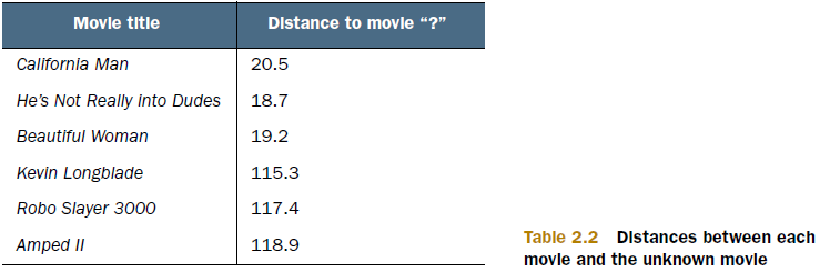 我们想知道一个电影XX是属于罗曼题材还是动作题材的,于是我们计算XX与上表中已知电影的各个距离,如下表: