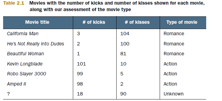 书中用的例子:要对一个电影进行分类,看它是属于哪个类别的。比如,已知下表: