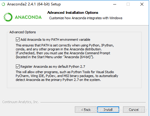 1、选择安装主版本,Anaconda2 ,按照正常步骤安装,勾选以下选项
