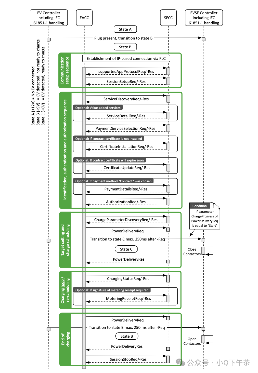 ISO 15118 通信协议是基于客户端-服务器(client-server) 模式的,由汽车充电控制器(EVCC) 发送请求消息(这些消息带有后缀"Req"),由桩端充电控制器(SECC)来返回相应的响应消息(带有后缀"Res")。EVCC 需要在相应请求消息的特定超时范围(一般在 2 到 5 秒之间)内收到 SECC 的响应消息 ,否则该会话将被终止,根据不同厂家的实现,EVCC可以再重新发起一个新的会话。