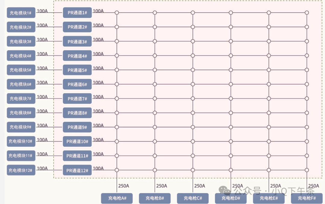 全矩阵的充电分配拓扑,解决了在满足所有充电均能充电的前提下,优先满足先充电车辆的请求,按车辆的充电需求和整体运行策略的优先级,实时进行功率柔性分配,遵循先到先得的逻辑,提高功率模块的利用率