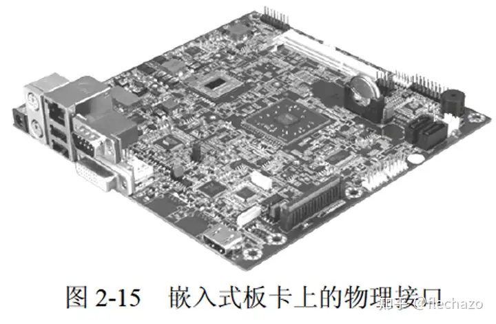 IO 设备一般包括设备本身和设备控制器。设备控制器是插在电路板上的一块芯片或-组芯片,接口是 CPU 和 IO 设备之间交换信息的媒介和桥梁。CPU 与外部设备、存储器的连接和数据交换都需要通过设备接口来实现。在计算机发展过程中,一些设备接口逐渐被标准化。接口可分为低速接口和高速接口。图 2-15 为某一典型的嵌入式板卡,其外围配置有不同的设备物理接口,包括电源接口、以太网口、RS-232 串口、DVI 数字视频接口、PS/2 鼠标键盘接口、USB 接口、GPIO接口等。在常见的嵌入式系统中,低速接口通常包括RS-232、RS-485、RS-422、SPI、IC、GPIO 接口等;高速接口通常包括以太网口(百兆、千兆)、Rapid-IO、USB 接口等。