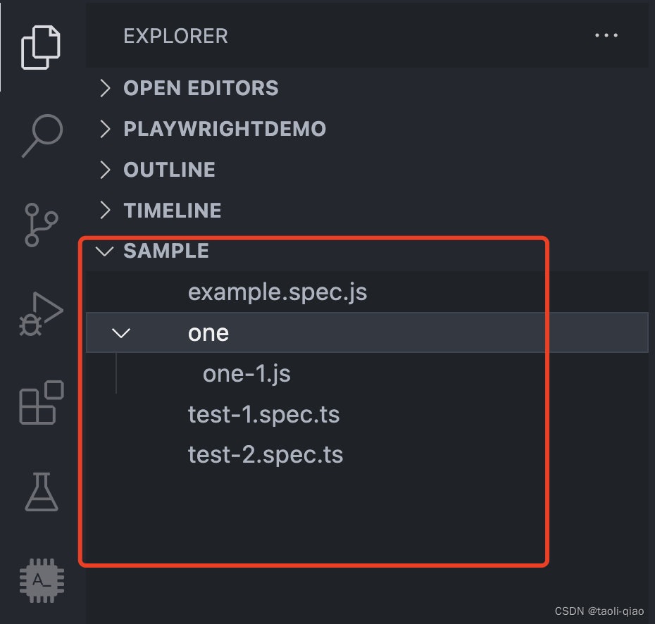 执行插件,可以看到,在左侧资源管理视图容器中,显示了名称为SAMPLE的视图,显示的内容正是tests目录下的文件名称,如果是folder,会折叠显示,点击folder,会显示folder下的文件名称。