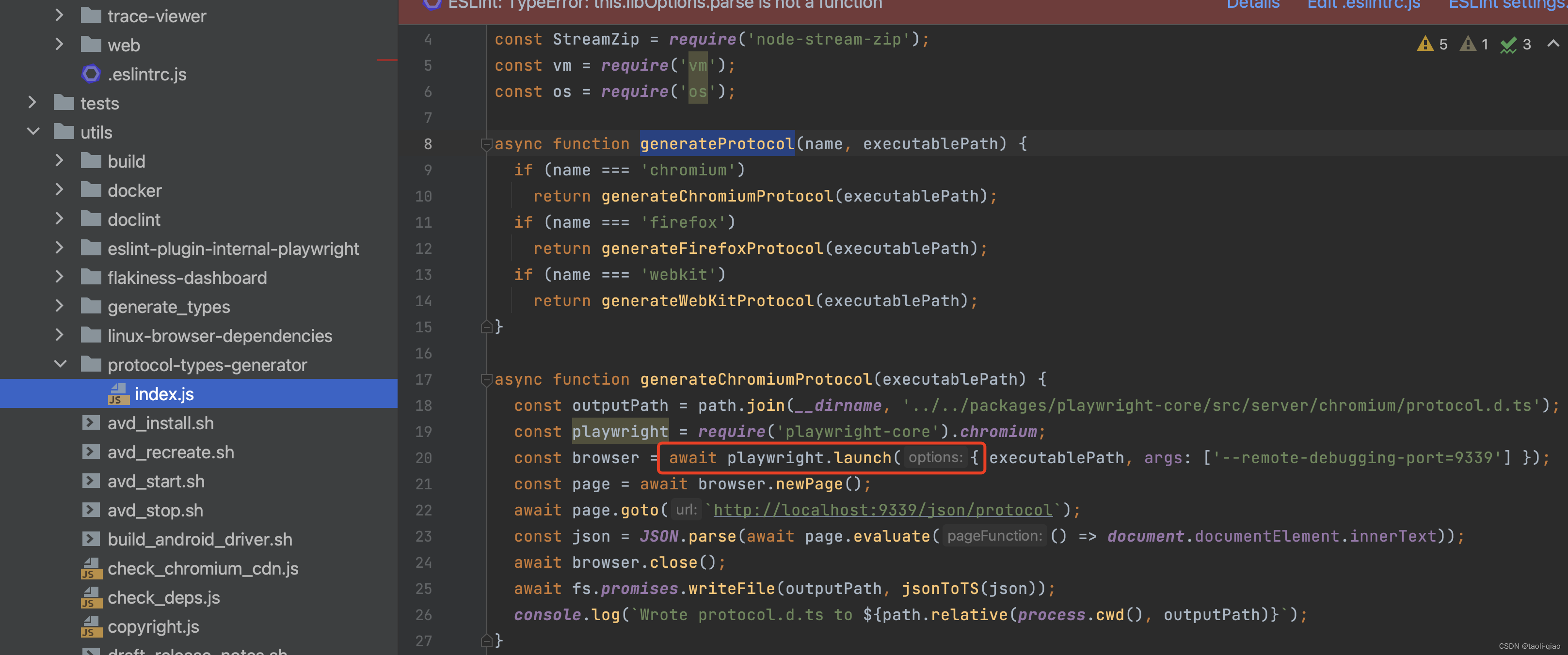 在util/protocol-types-generator目录下的index.js文件中,可以看到调用了playwright.launch()方法可以加载启动不同的浏览器,例如chromium,firefox,webkit等。这里调用的还是playwright-core中的chromium包来launch浏览器的。