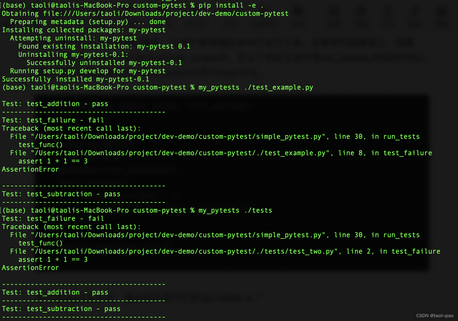 定义好setup文件后,通过命令进行打包"pip install -e .",就可以通过my_pytests命令执行文件了,例如“my_pytests ./test_example.py” or "my_pytests ./tests".执行结果如下所示:
