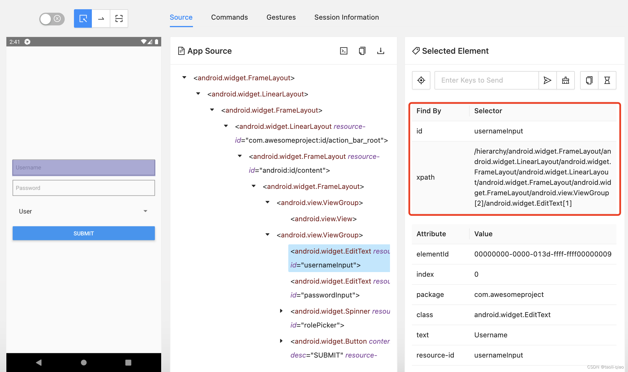 以下图为例,当选中左边的username input输入框的时候,右边的locator有两种方式,第一种是通过id查找element,第二种是通过xpath查找element。当确定了selector后,appium-inspector会调用appium server的api来确认是否能查找到元素。
