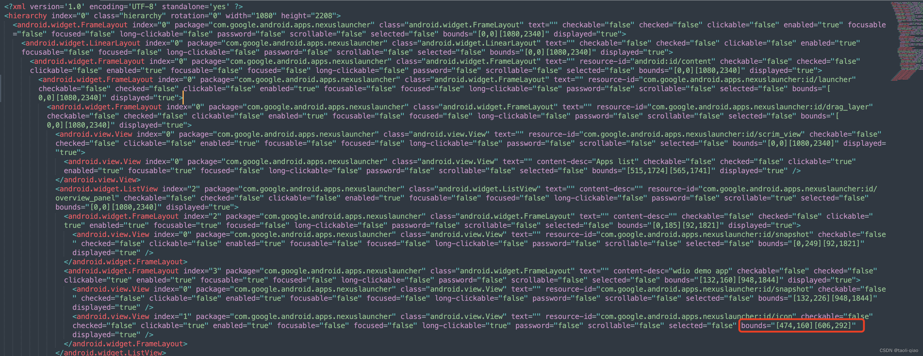 上面生成locator的前提是要给出选定element的相关信息,从appium-inspector中下载source page,如下图所示,source page中除了有元素的content-desc等信息外,还有个关键信息是bounds,也就是元素的坐标信息。当鼠标选中某个element的时候,可以计算得到element的坐标信息,再根据这个坐标信息从source page中获取到对应的目标元素信息。那appium-inspector是什么时候计算所选元素的坐标信息的呢?