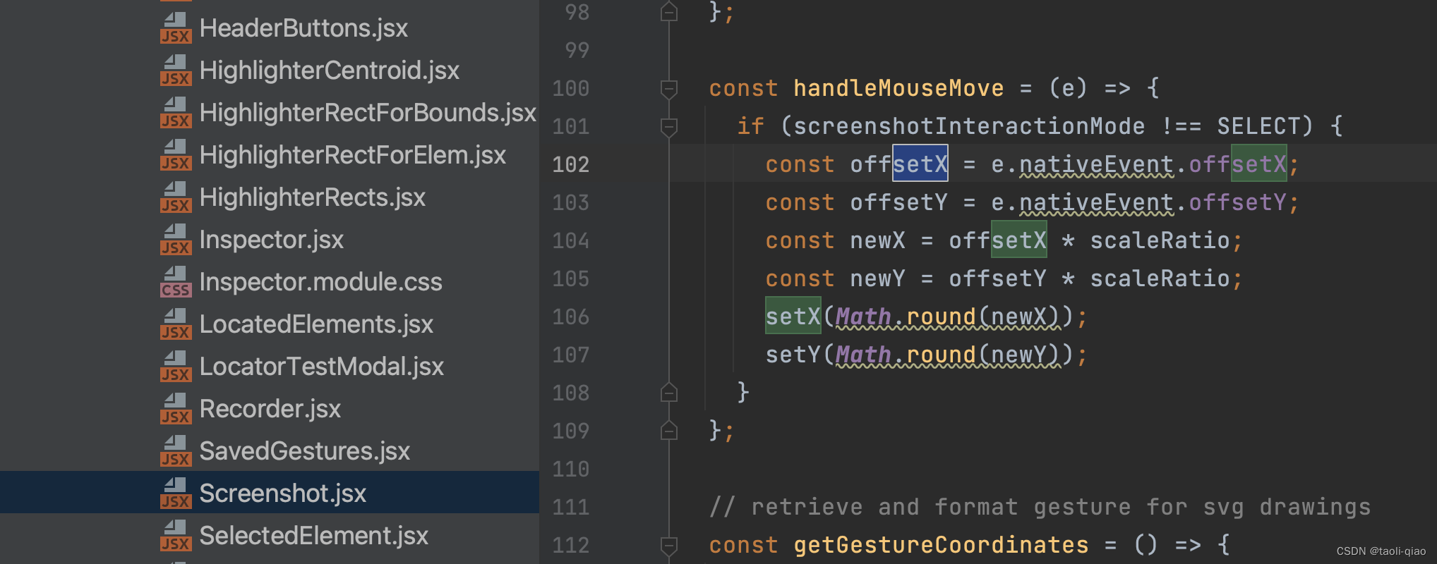 在component目录下的Screenshot.jsx文件中,有个handleMouseMove的方法,可以看到,当鼠标移动的时候,这里会调用setX,setY来设置坐标信息。
