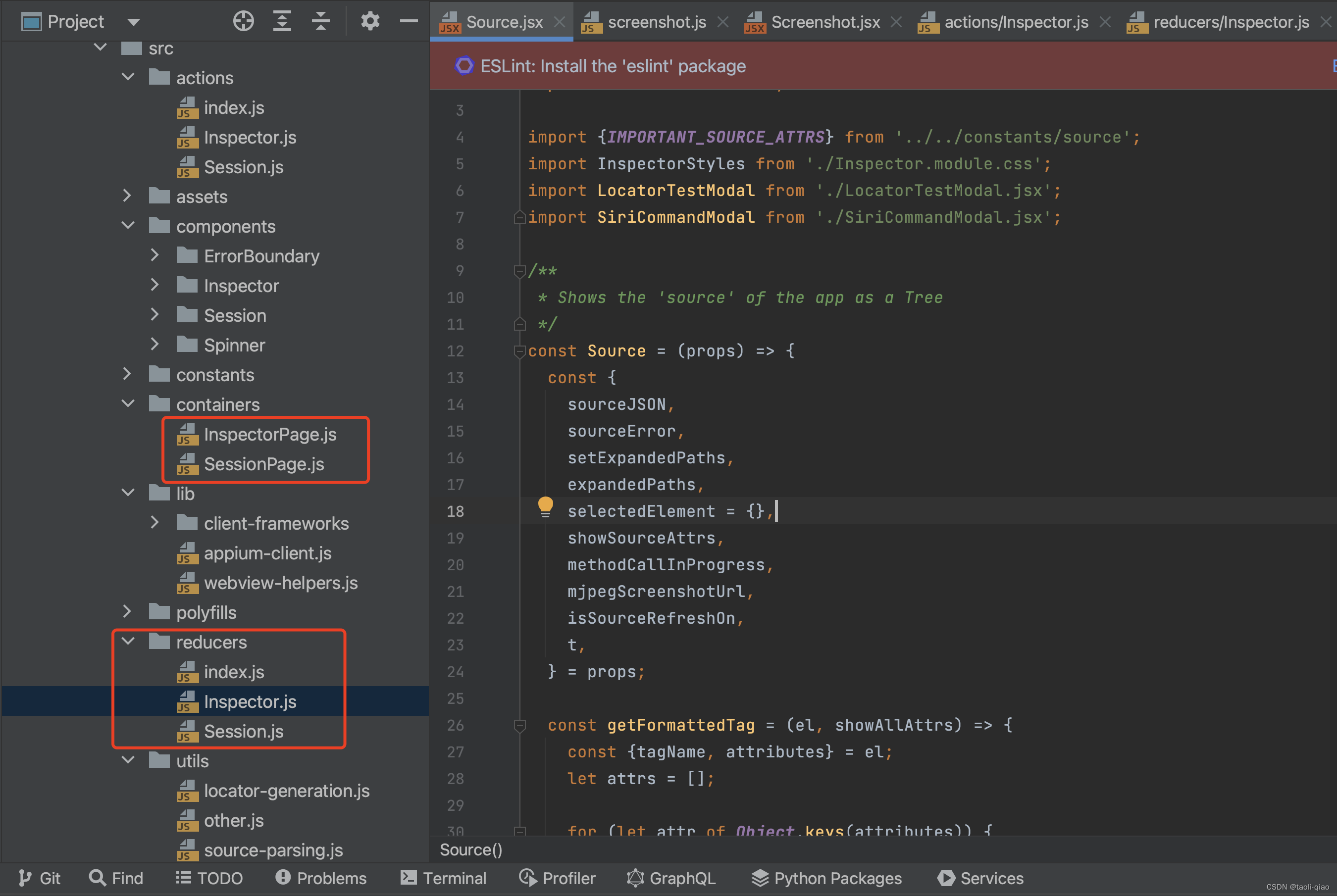 下图是appium-inspector source code,component里面是用react写各个自定义组件,这些组件会组合到containers下面的InspectorPage.js和SessionPage.js中,其中SessionPage.js及时appium-inspector连接信息输入的界面,InspectorPage.js就是连接成功后显示source page,locator等信息的的界面。另外,这里使用了react reducers技术,在 React 应用中,useReducer 钩子是一种处理复杂状态逻辑的方式,特别是当组件状态由多个子值组成,或者当状态逻辑需要根据多种不同的动作进行更改时。